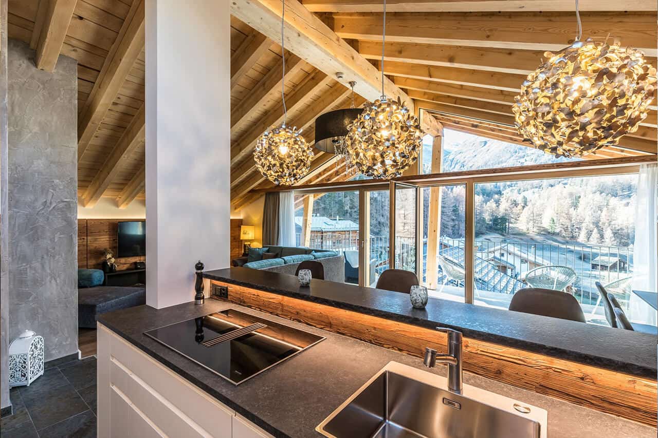 Der lichtdurchflutete Wohn- und Essbereich mit Balkon und freiem Matterhornblick lädt zum Verweilen ein. Die offene Küche ist vollständig ausgestattet – perfekt für gemeinsame Abende oder ein Frühstück in der Morgensonne.