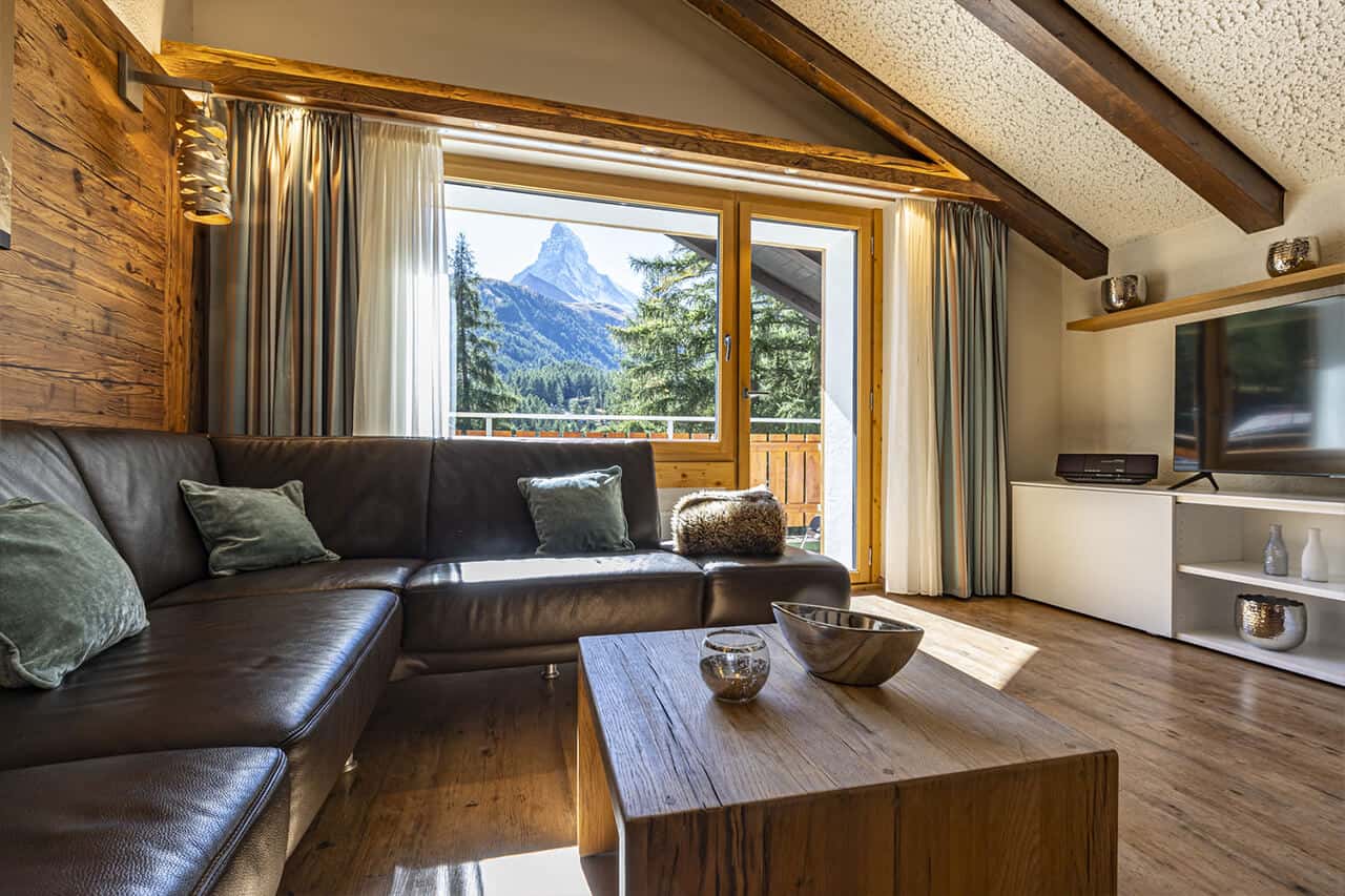 Ein weiteres Highlight ist die private Terrasse oder der Balkon mit direktem Matterhornblick – ein Panorama, das jeden Aufenthalt besonders macht.