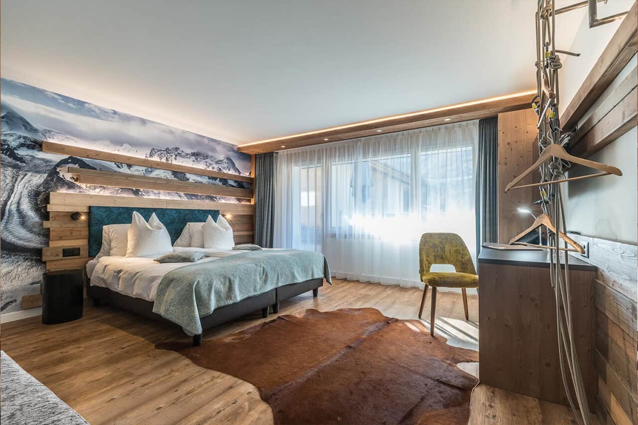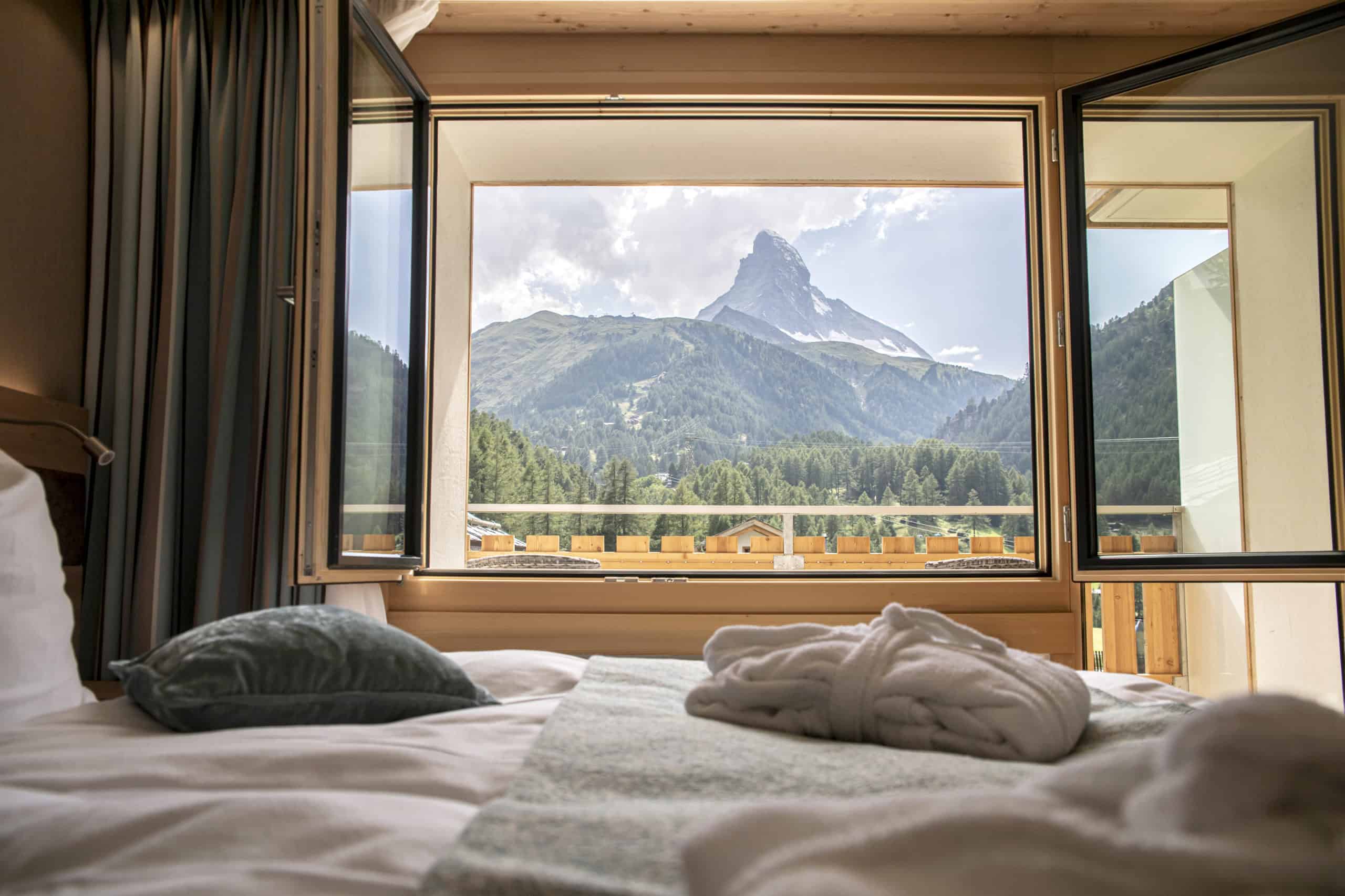 Les chambres doubles Alpinstyle 22m2 avec vue sur le Cervin se trouvent dans la maison Zeus, 2. ou 3ème étage et sont équipées de douche/WC.