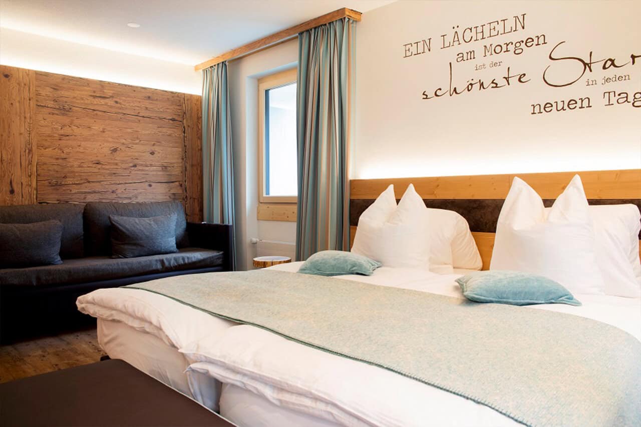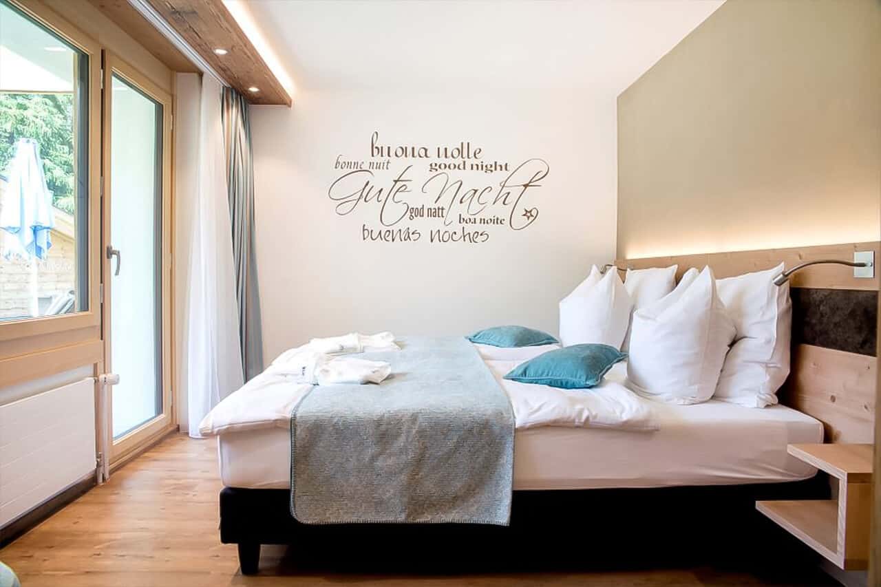 La chambre double Alpinstyle Superieur se trouve au rez-de-chaussée dans la maison Zeus et est équipée d’une douche/WC.